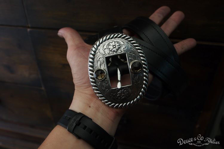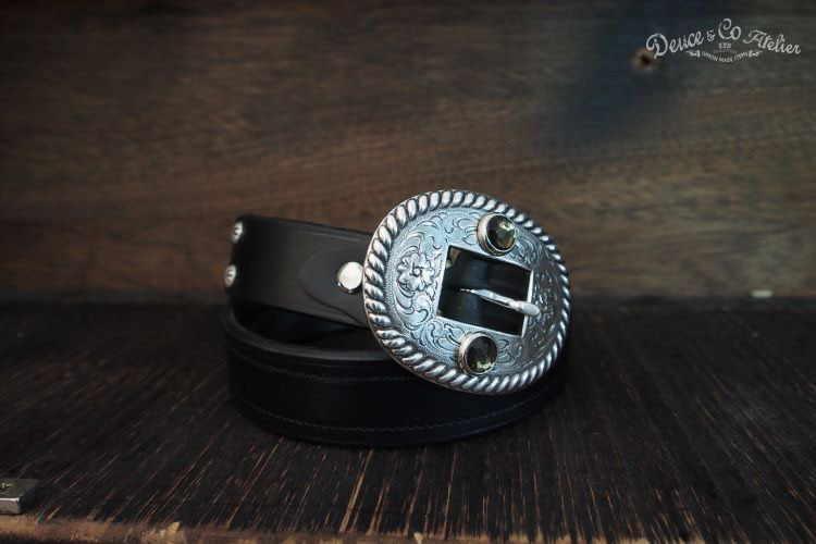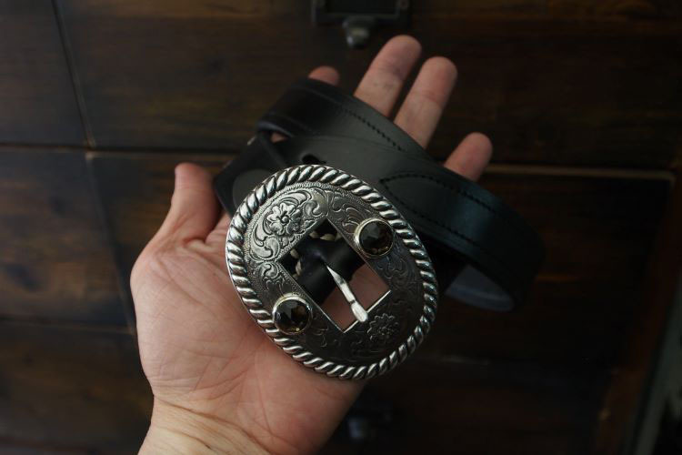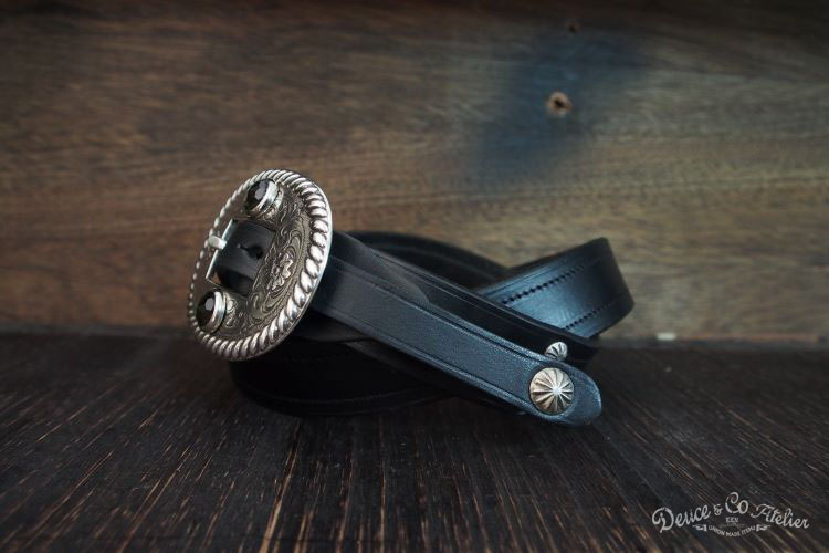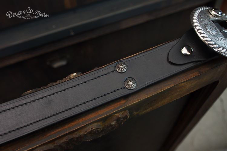 帶身與帶扣上並以999純銀(比925銀更精純)表面處理的黃銅銀貝釘鑲嵌其中,