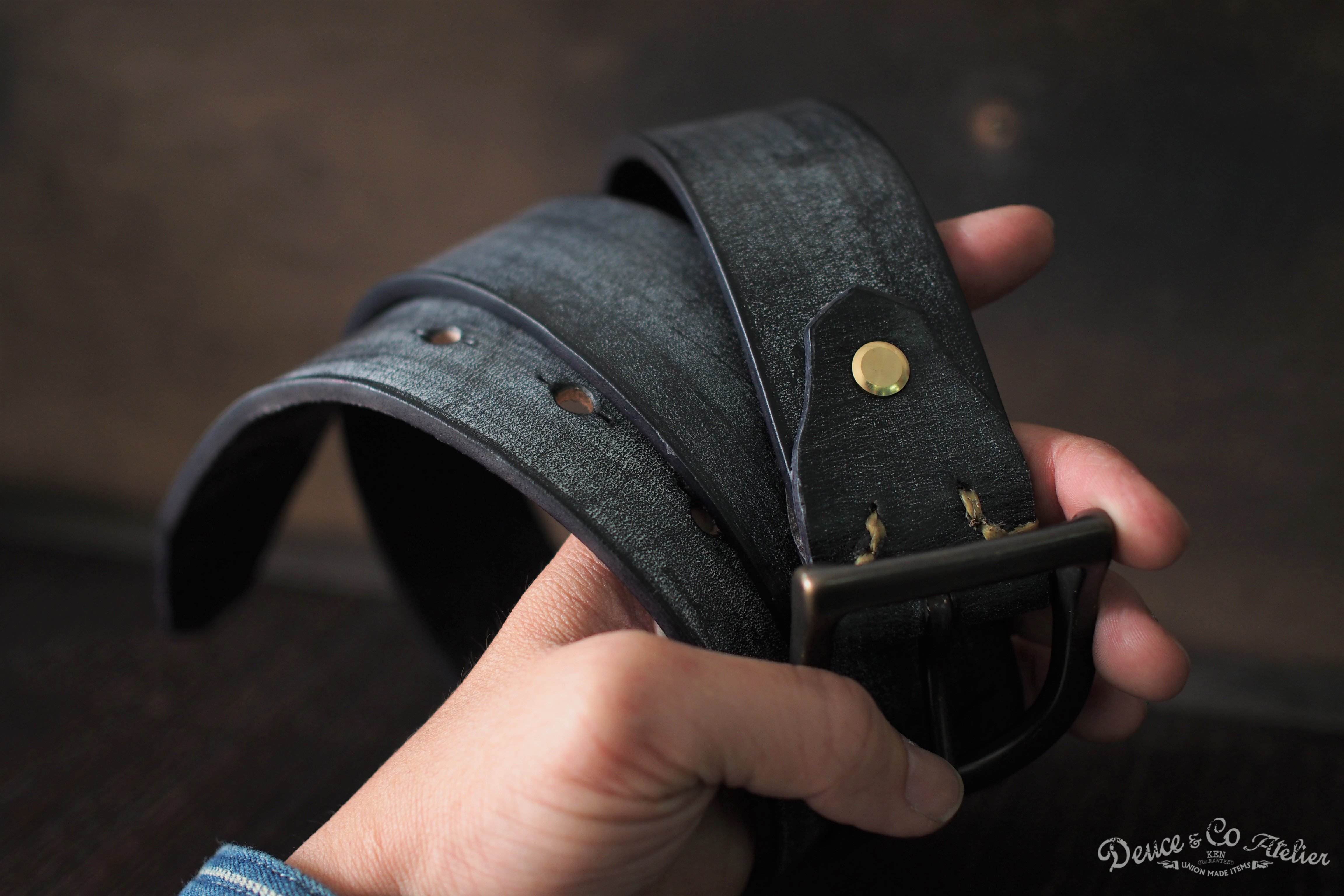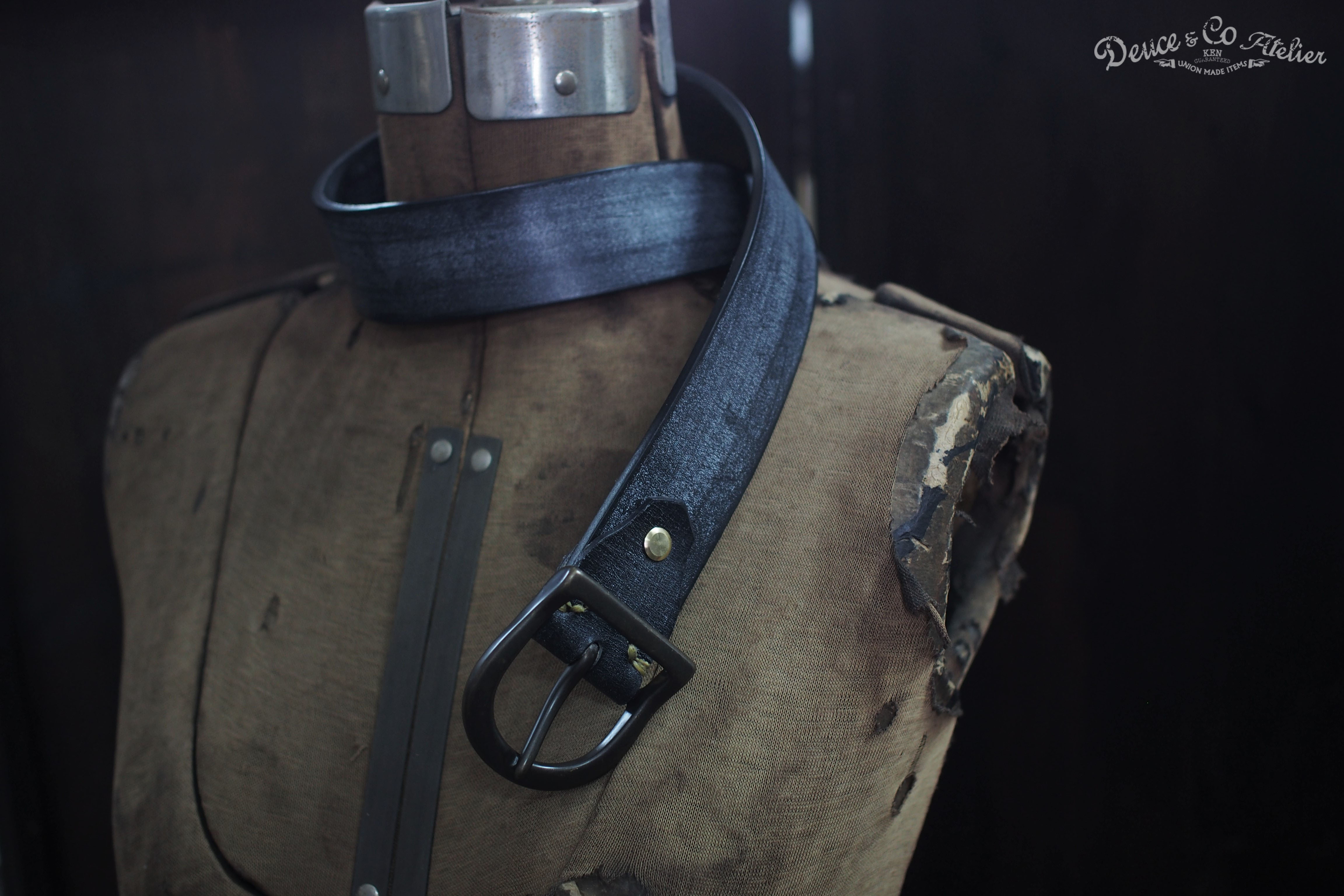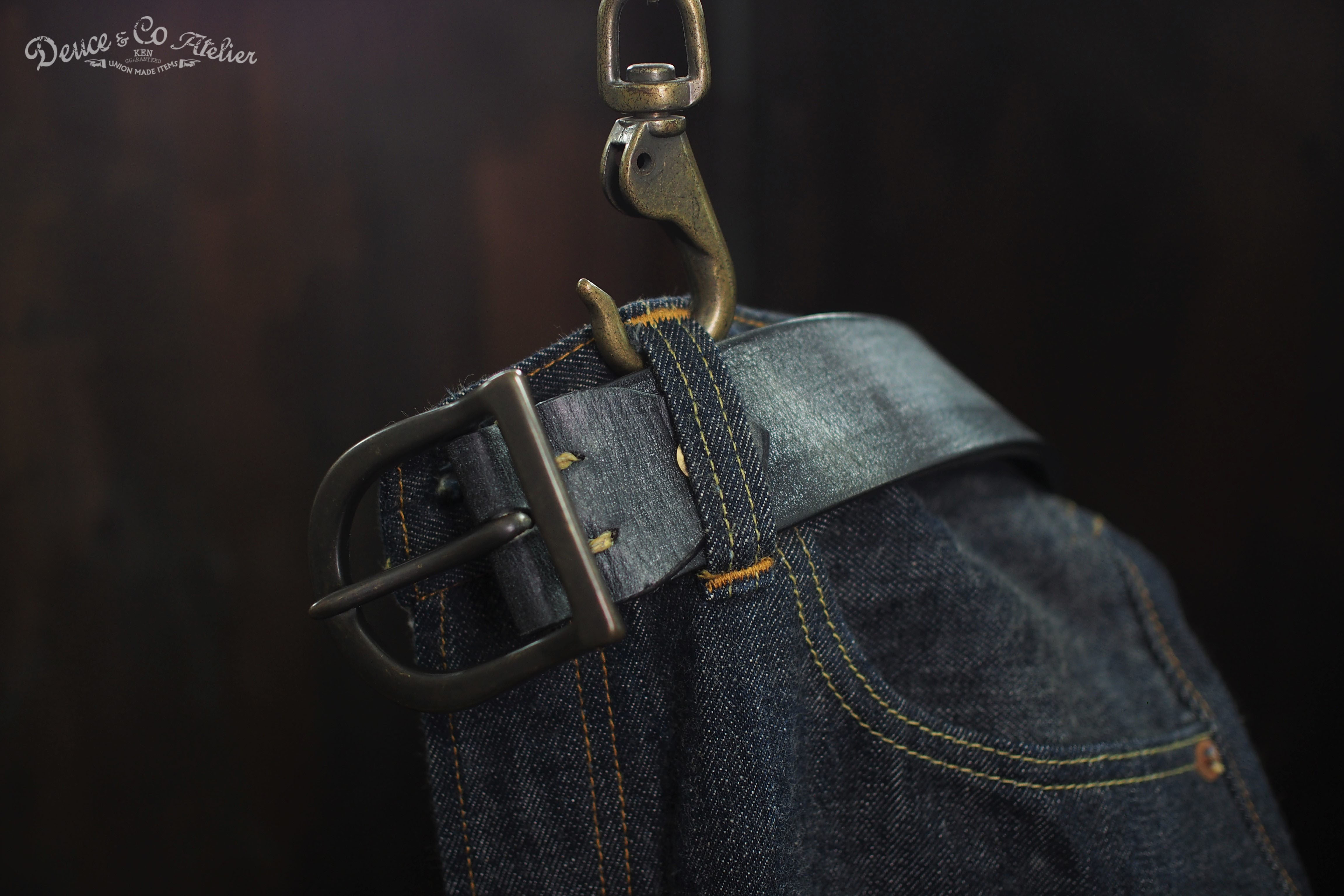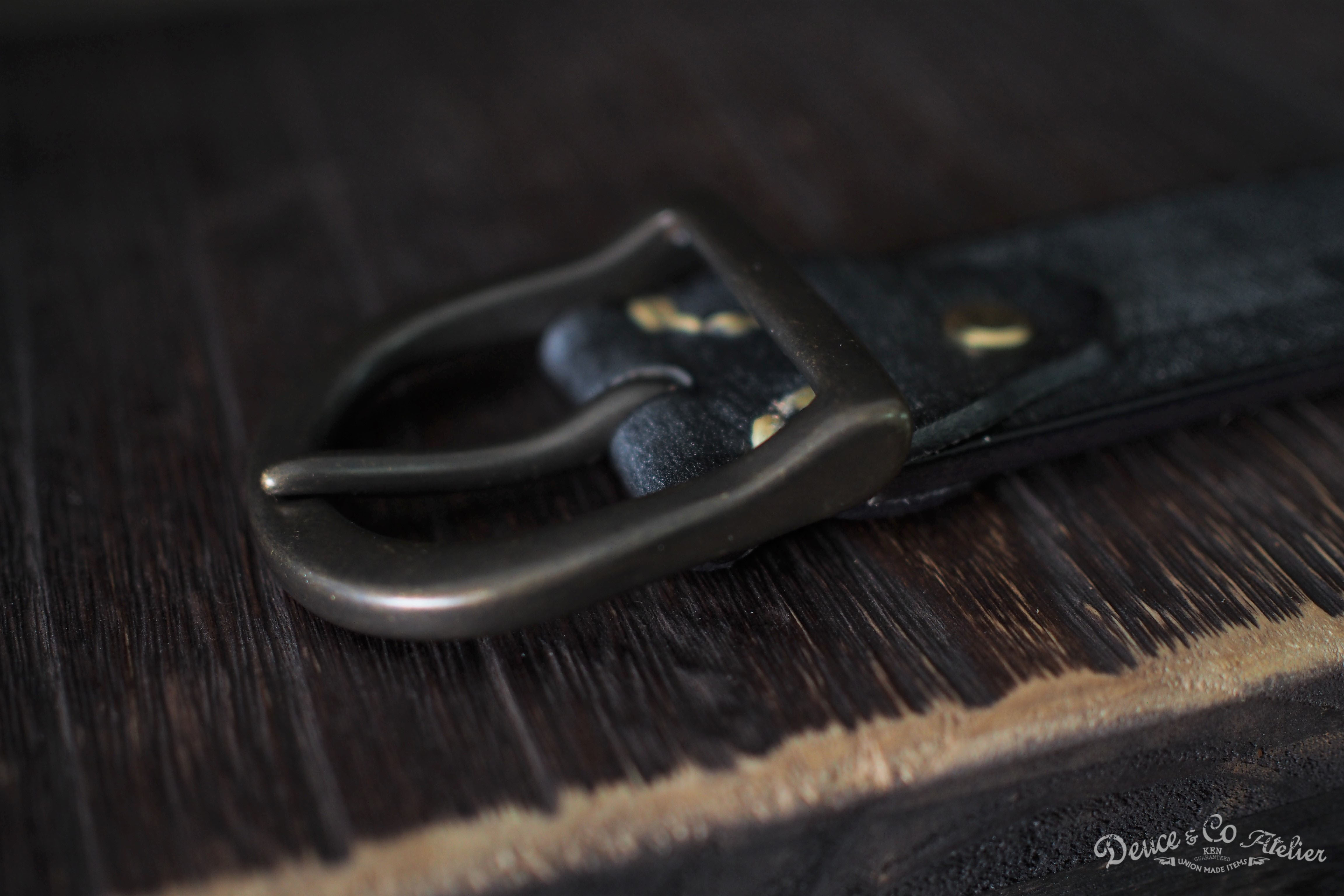 粗曠的3.8cm 皮帶寬度, 黑色重蠟革皮身搭配古銅馬具帶釦,