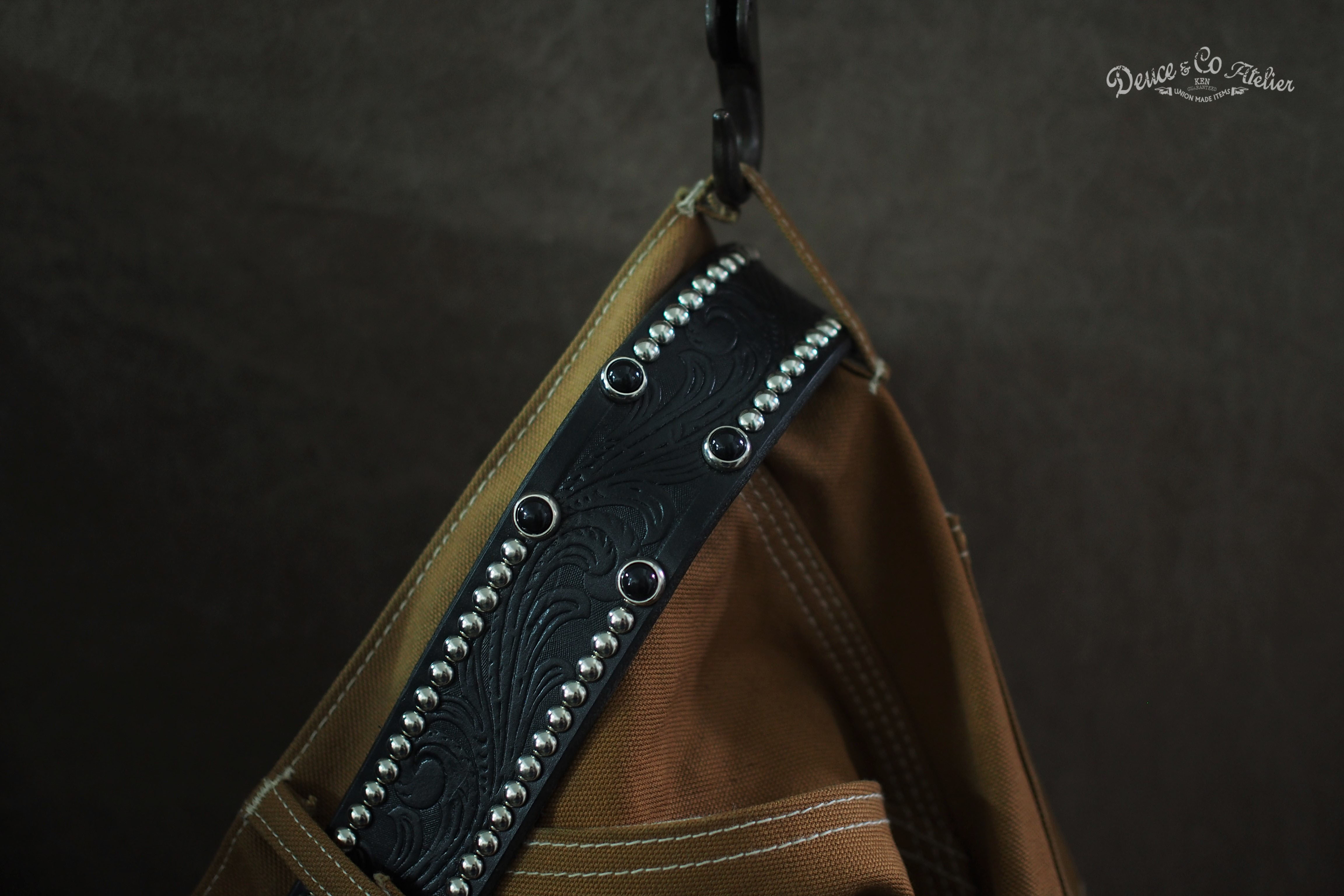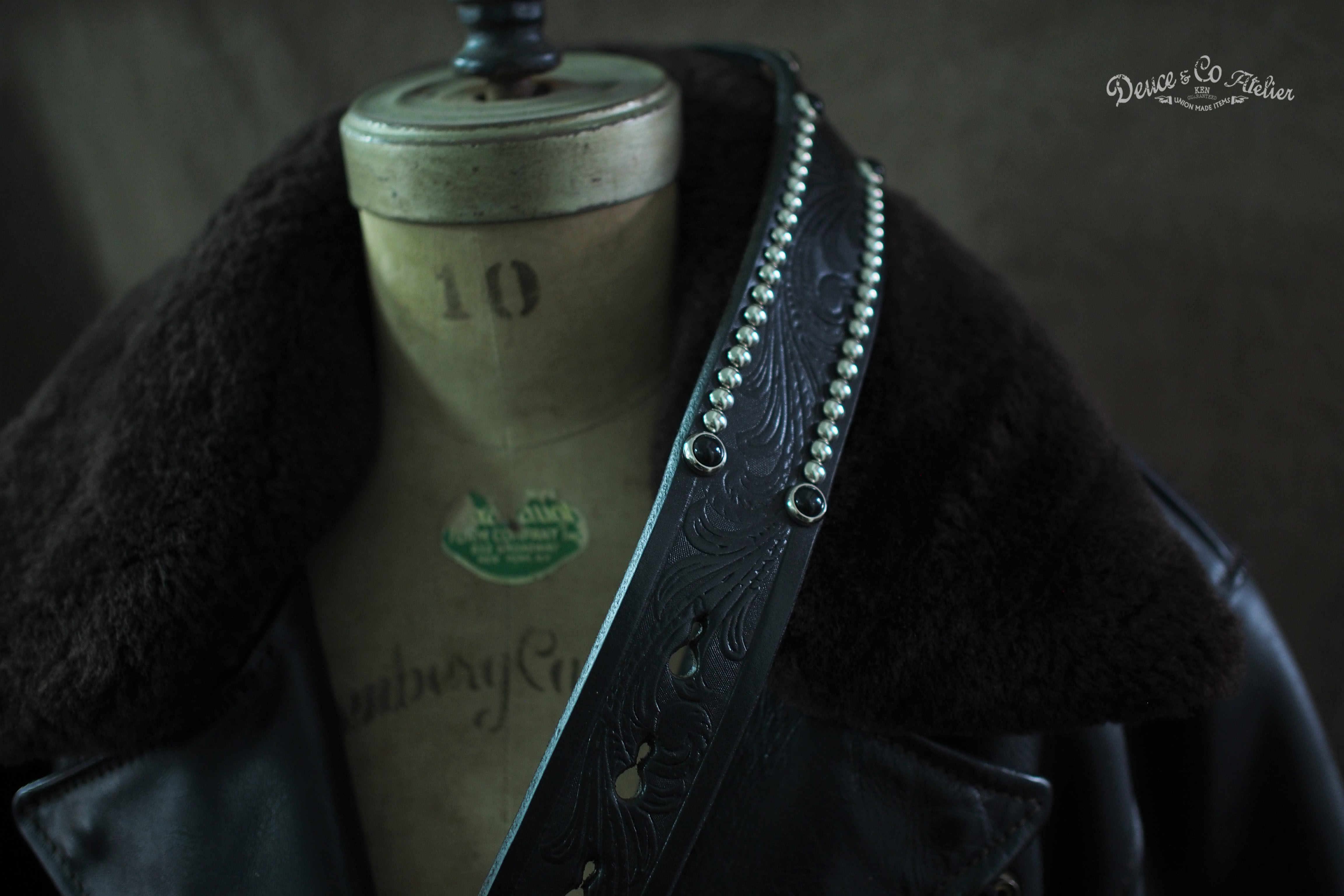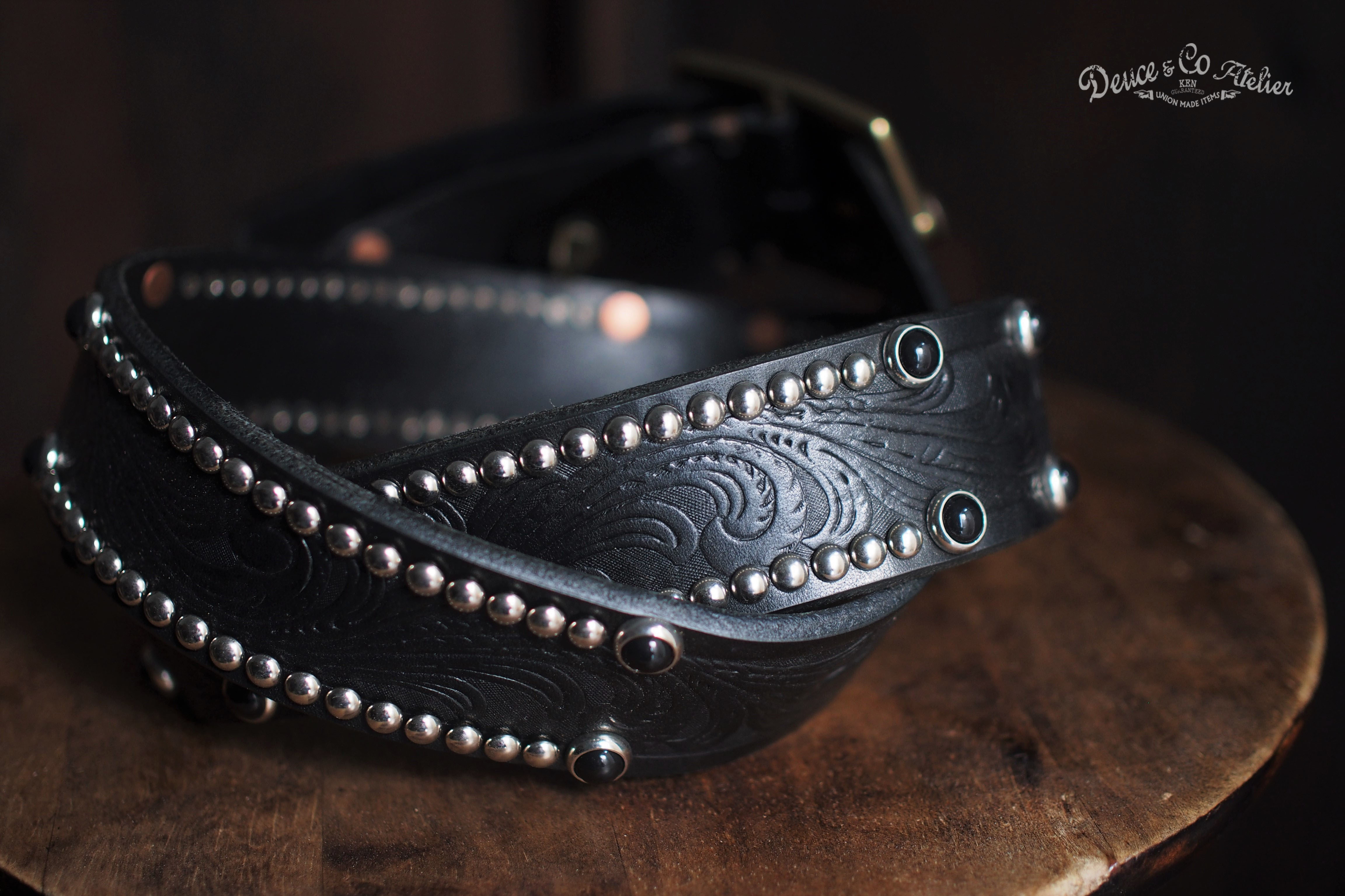 於寬版皮身上釘製銀銅釘與黑彩珠的排列設計, 展現出DEUCE&CO.品牌獨特老味性質