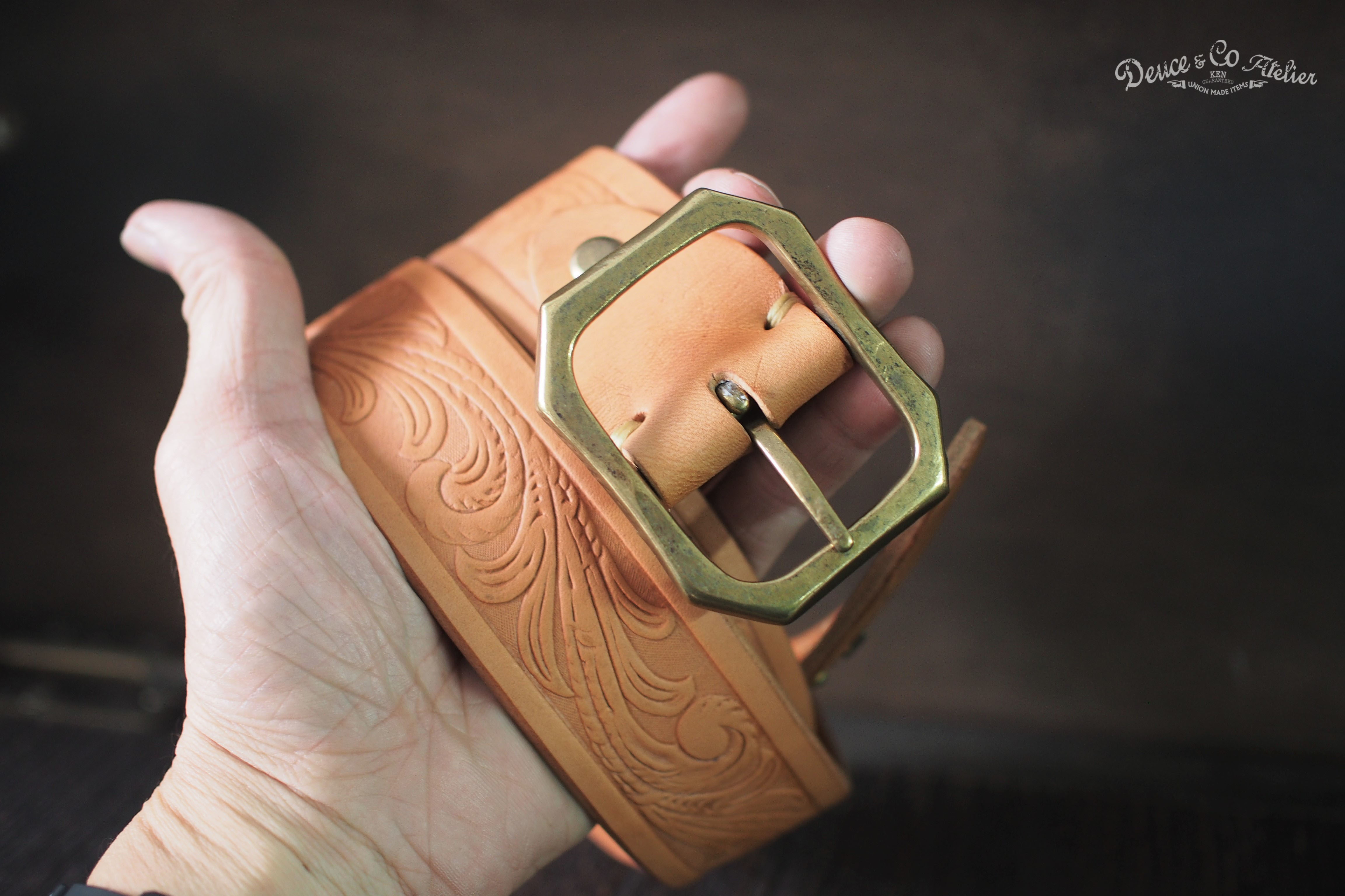 以義大利佛羅倫斯多脂植鞣原色皮革打造寬約38mm帶身,