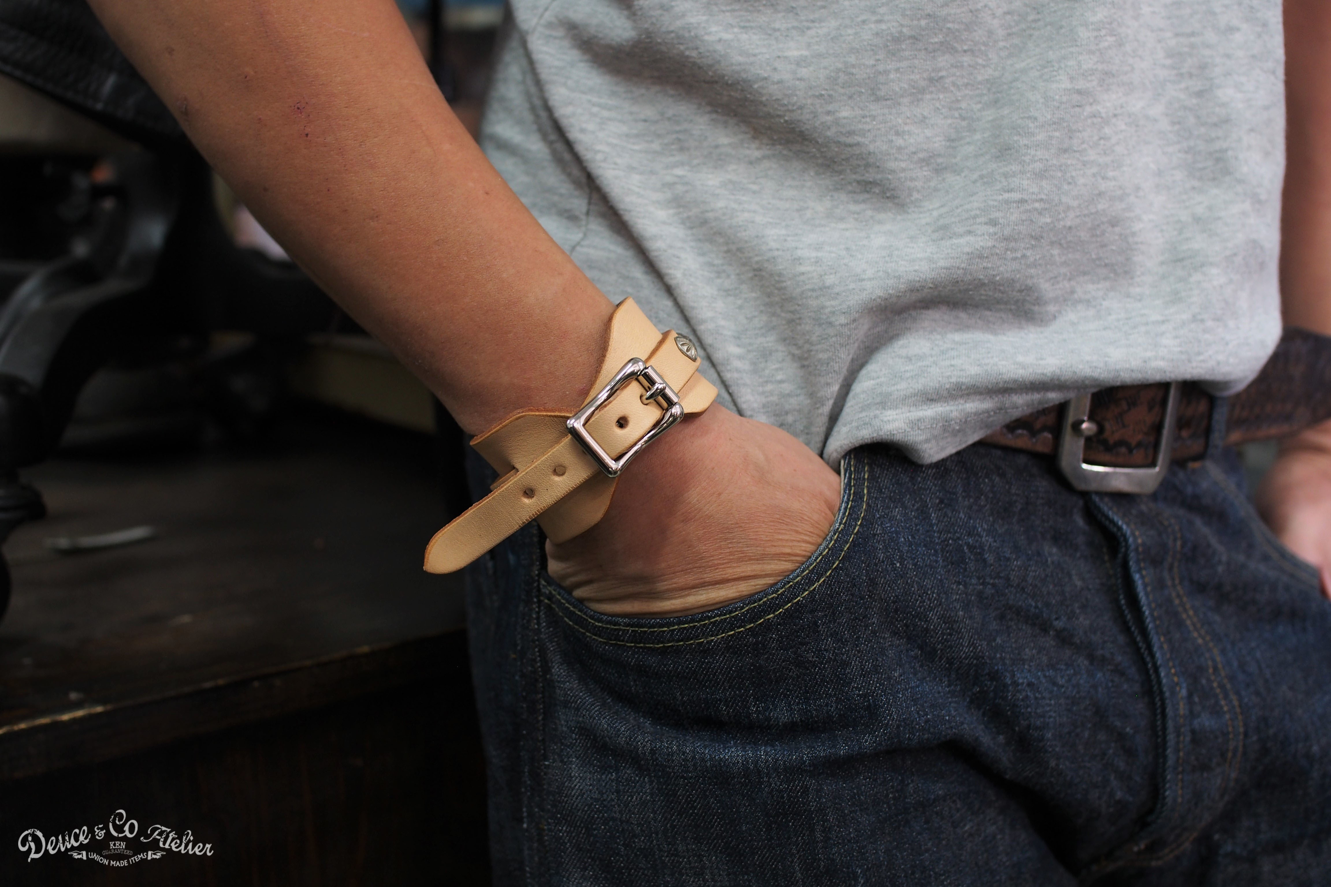 棕色搭配丹寧褲後更有復古粗曠的整體感受, 讓手環單品能在使用上附有樂趣與實用性