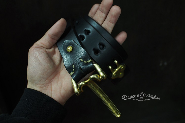 銅質銀貝釘釦也是一大特點, 完整了皮帶的金具設計,