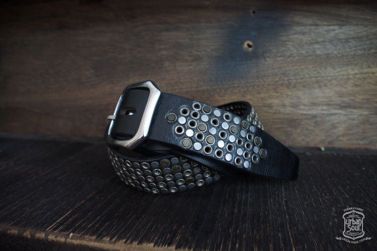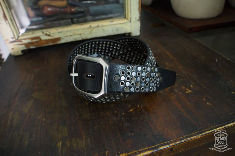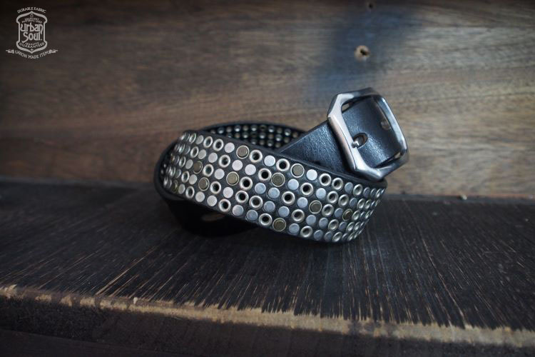 而在皮身上加上多顆銀銅圓鉚釘設計, 算是款極為特色皮帶, 並也增添了皮帶的豐富性