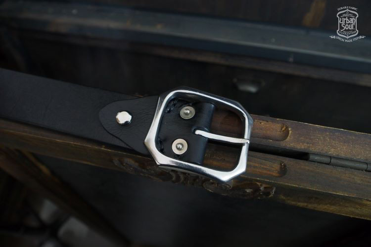 皮帶頭的部分選用內凹銀色方形帶釦, 使用牛津線手縫技術緊密接合於皮身,並採奶嘴釘固定於皮身